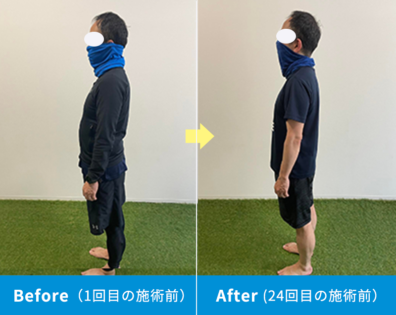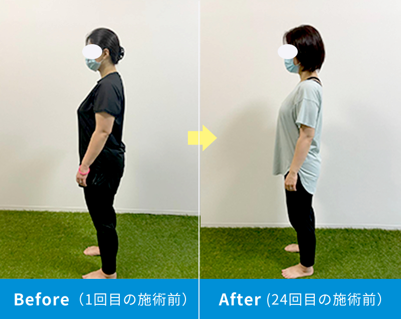 狙った筋肉を意識に的に動かせるようになった事で効果をご実感頂き、見事に姿勢が整い猫背が改善。